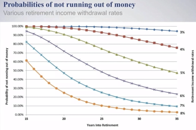 Take an example you may have heard before. You’ve been diligently saving in your 401k plan throughout your life to amass a $1MM nest egg you need to turn into income in retirement. Based on the running Monte Carlo simulations on market performance, it has been determined that a 4% withdrawal rate would be safe to minimize the chance of running out of money (see below chart).