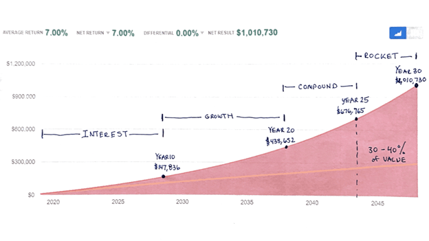 Now, understanding the phases of the compound interest curve can help you fully appreciate its power. In the below example, if you invested $10k per year for 30 years earning 7% you would reach over $1MM.